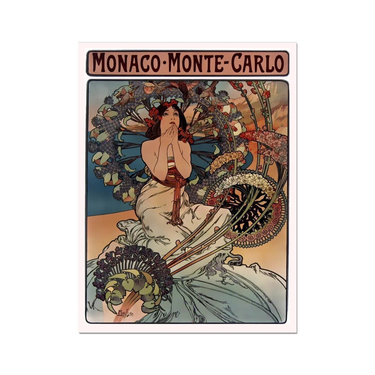 This vintage poster is advertising tourism and travel for the Monte-Carlo. The print features a woman in etherial dress, surrounded by birds and flowers. The illustration captures the glamour of times gone by and was originally made, 1934 by Alfonse Mucha in 1897 and you can see his signature on the print.