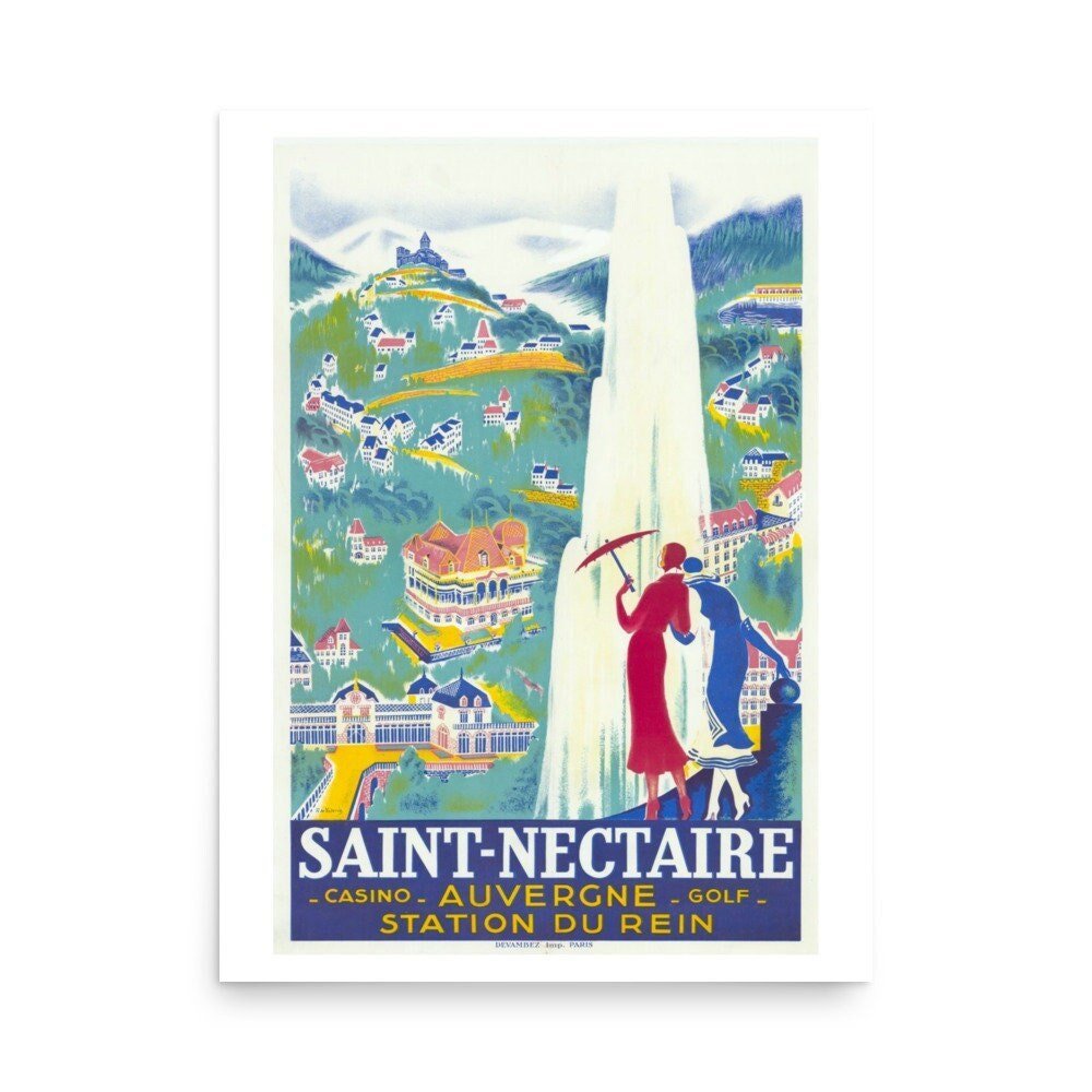 The art-deco poster print of Saint Nectaire in 1931, features two women in 1930’s dress, looking down on Saint Nectaire. One is in blue, the other red. One lady is holding an umbrella. The town is seen in green countryside and the casino, golf links and station can be seen with the famous church on top of a hill in the back ground.