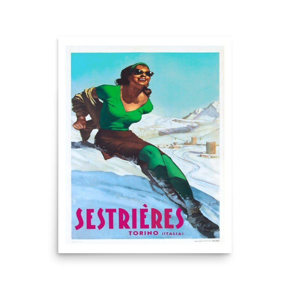 This vintage art deco retro travel poster features a woman sitting on the snow in the sun, taking her sweater off. You can see the resort and snowy mountains in the background and snow on the ground. The original illustration was drawn by Gino Boccasile probably around 1941 to promote tourism in the area, and it and it encapsulates the glamour of travel in times gone by.