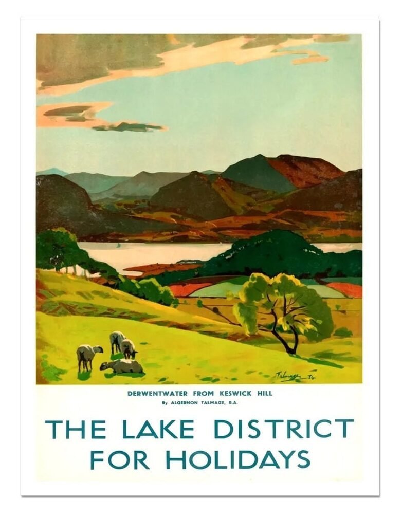 This vintage poster is advertising tourism and travel, for the Keswick – London Midland and Scottish railways, in the Lake District area of Britain. It features an illustration orginally by Algernon Talmage in 1934, Derwentwater from Keswick Hill.