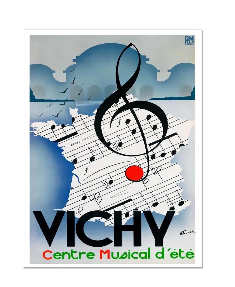 This vintage French Tourism poster for PLM trains, travel and tourism advertises travel to Vichy, the summer musical centre. It features a map of France with a musical score and a treble clef and Vichy in the shadows in the background. The illustration was orginally made in the 1930’s by H. Fevrier. The poster would make a great gift for a train, travel or music enthusiast.