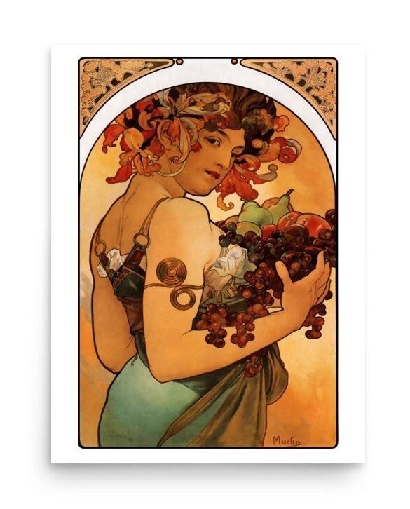 Alphonse Mucha Le Fruit vintage print from 1897 This ethereal art nouveau poster was originally by illustrator, Alphonse Mucha. It has been carefully digitally restored to remove any major signs of wear and tear.