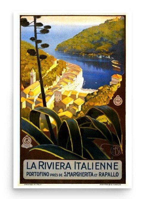 Vintage Italian travel poster print of The Italian Riviera featuring Portofino, S Margherita and Rapallo. Add some vintage style and character to your home, whether your study, bedroom, living room or reading nook. This vintage retro travel poster encapsulates the glamour of travel in times gone by and would make a lovely gift to travellers or Italophiles. The poster is printed when you order to ensure its freshness. • Paper thickness: 10.3 mil • Paper weight: 5.57 oz/y² (189 g/m²) • Giclée printing quality • Opacity: 94% • ISO brightness: 104%
