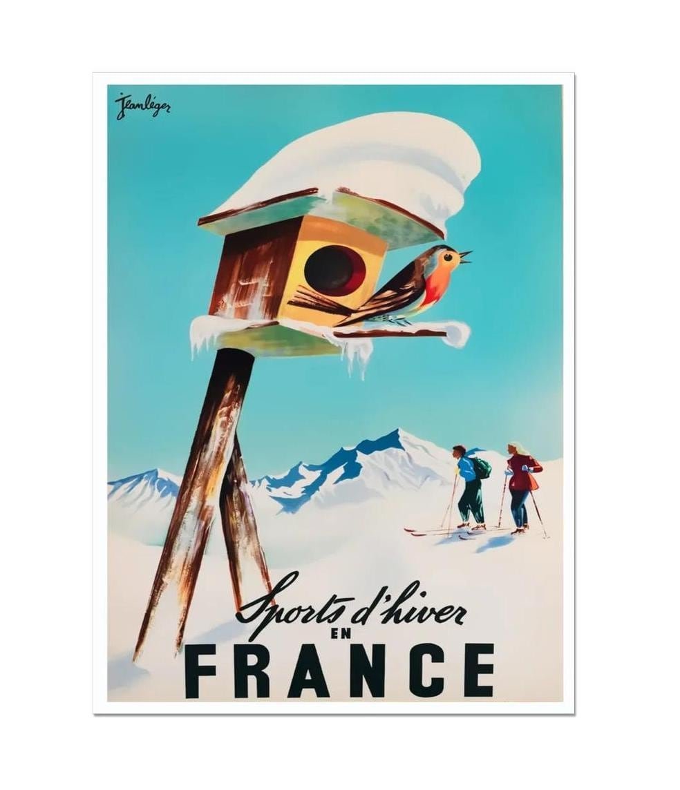 This vintage retro winter sports in France poster or Sports D’Hiver En France features a winter scene with two skiers in the background with snowy mountains further in the distance, with a snow topped bird house with a chirpy Robin, in the foreground. The illustration was originally made in the early 1950’s by Jean Leger.
